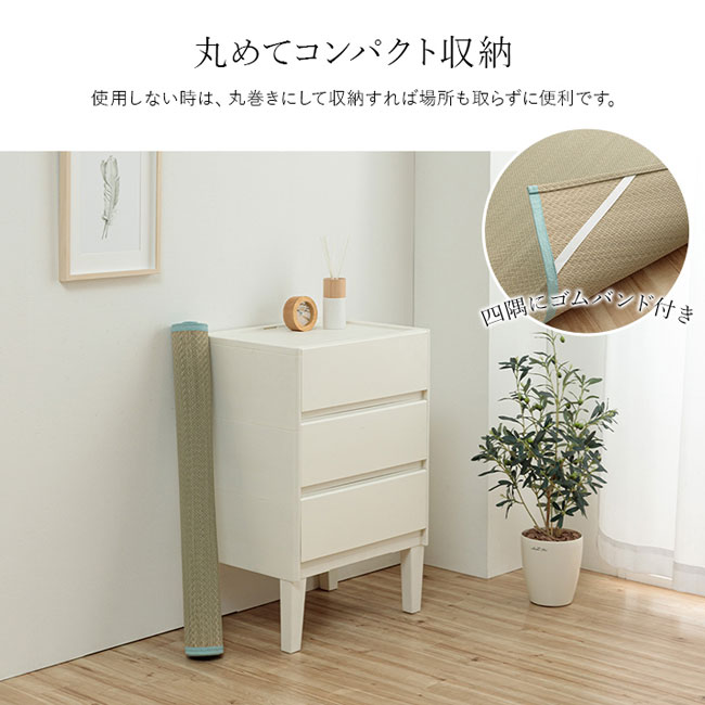 赤ちゃんや子供はたくさん汗をかきます。い草シーツは汗を吸収してサラリと過ごせる快眠シーツです。通常、い草は草の青さを保ったり、日焼けをしにくくする為に「染土」といわれる泥でい草を染める作業を行います。その作業をしない無染土い草を使用した商品です。泥染め加工を行ったい草とは違い、素材そのままのい草ですから、粉っぽさもなく、ほこりがたちにくく、肌触りが良いので快適な睡眠をサポートします。四隅にゴムバンドが付いており、ずれにくくなっています。