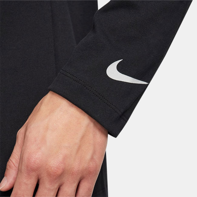 滑らかなジャージーニット素材は軽量で通気性に優れています。胸にはリフレクト素材を使用した夜間でも視認しやすいスウォッシュのビッグロゴが配置され、スポーティで洗練された印象を与えます。